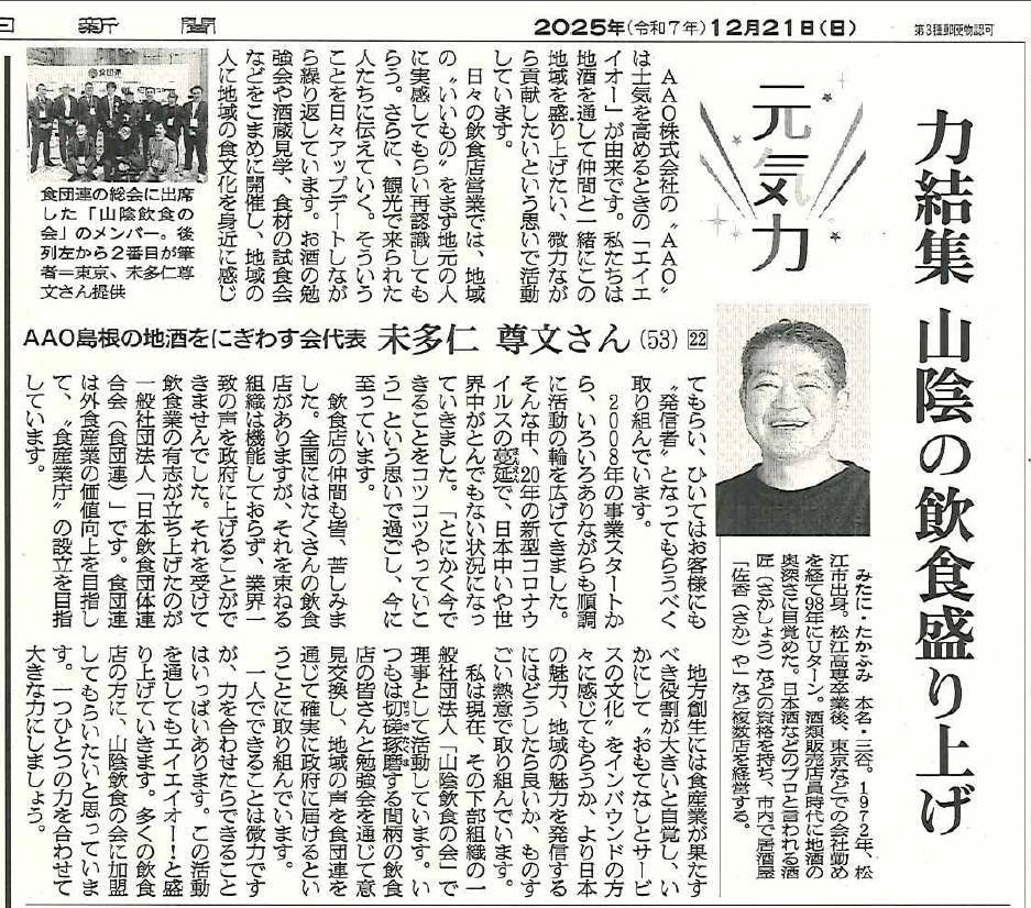 【朝日新聞 元気力】2025/12/21 力結集 山陰の飲食盛り上げ